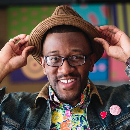 Jamaal Eversley is an artist and curator based in MA. Recently, he created the Real FRIENDS exhibit at the New Art Center which was a collaboration between Eversley and multiple other artists. His art is often abstract, and in many of his pieces, he focuses on the iconic image of a nerd.